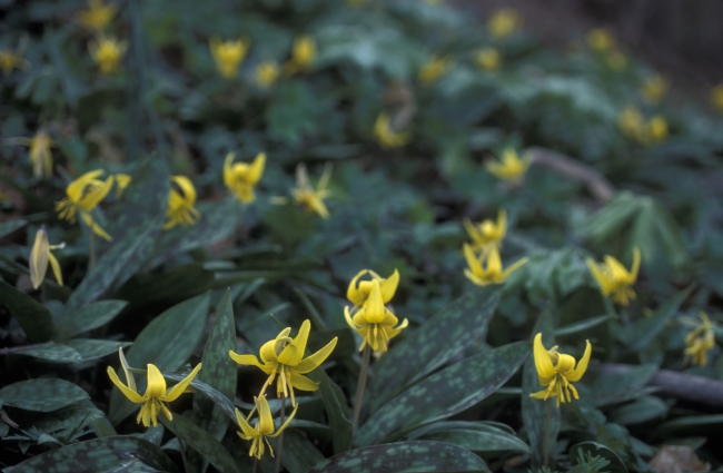 A view of many yellow trout lily flowers. This plant is also known as the dogtooth violet.