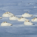 Trumpeter swans sleeping on snow at Wyoming's Seedskadee National Wildlife Refuge