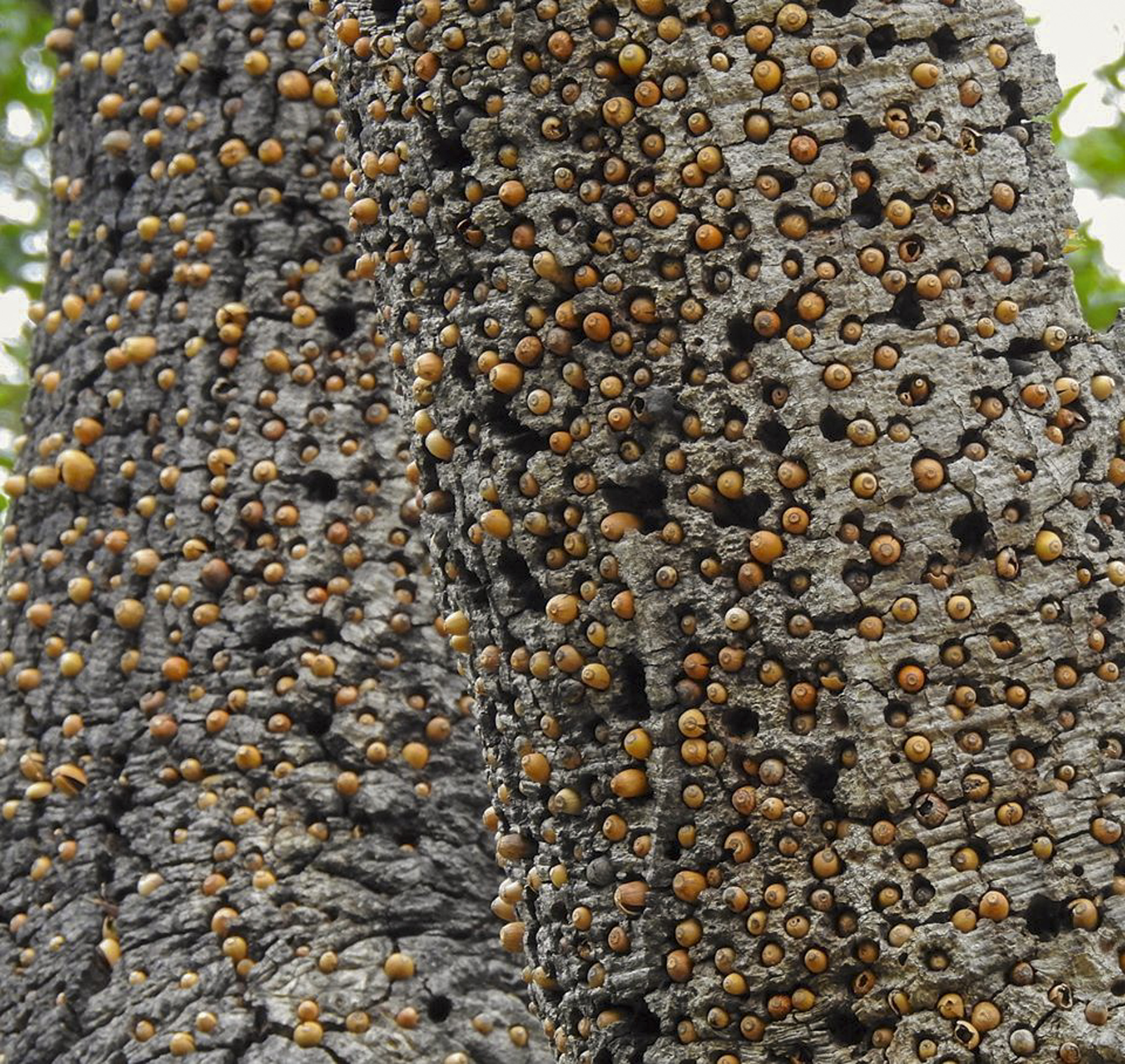 An acorn woodpecker granary tree. Photo courtesy of Lorraine Bruno