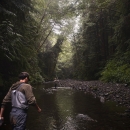 American Conservation Experience intern Ethan Chaipatanapong walks through the water while conducting an electrofishing survey on a tributary of the Tsoo-Yess River.