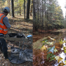 At left, an archaeologist sifts through the mud for artifacts. At right, a wet lane at Blackwater National Wildlife Refuge.