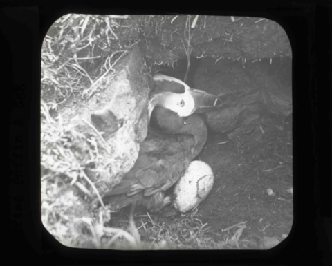 A Tufted Puffin guarding its egg at Three Arch Rocks while Finley and Bohlman capture the shot during a 1903 photography trip to the area.