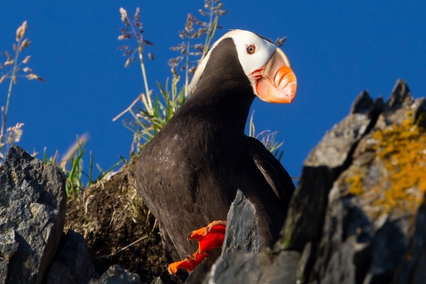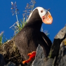 Tufted puffins burrow all along the coastline of Kodiak Refuge during the summer. Wintering out to sea, they return to Kodiak each May to breed and nest.