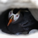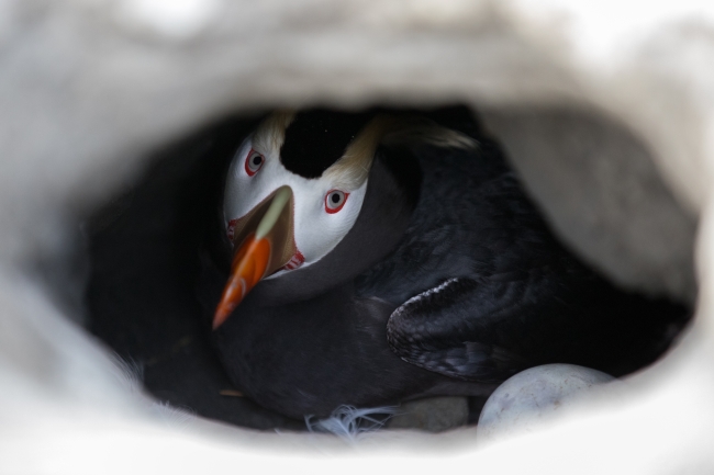 A tufted puffin peers out from an island burrow in Alaska Maritime National Wildlife Refuge.