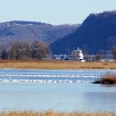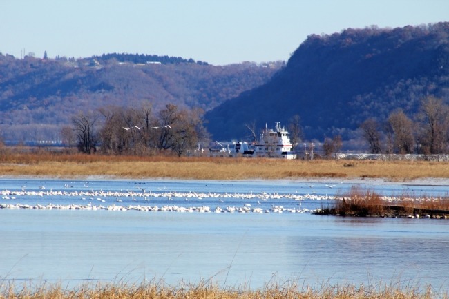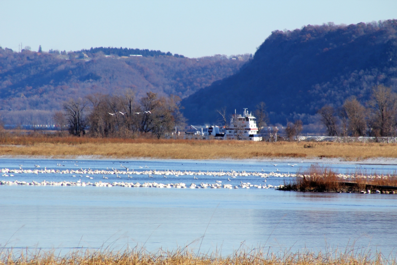 Thousands of tundra swans rest on the Mississippi River on the Upper Mississippi River National Wildlife and Fish Refuge near Brownsville, MN