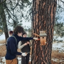 A volunteer is instructed on how to open a bird box