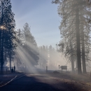 Sunrays diffuse through smoke between some trees during a prescribed fire at Turnbull NWR.
