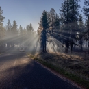 Sunrays diffuse through smoke between some trees during a prescribed fire at Turnbull NWR.