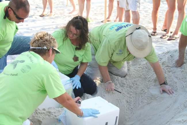 July 12, 2010 - Gulf Shores, AL: Members of Share the Beach, a trained sea turtle watch group, begin the excavation. Photo by Barbara Maxfield, USFWS.