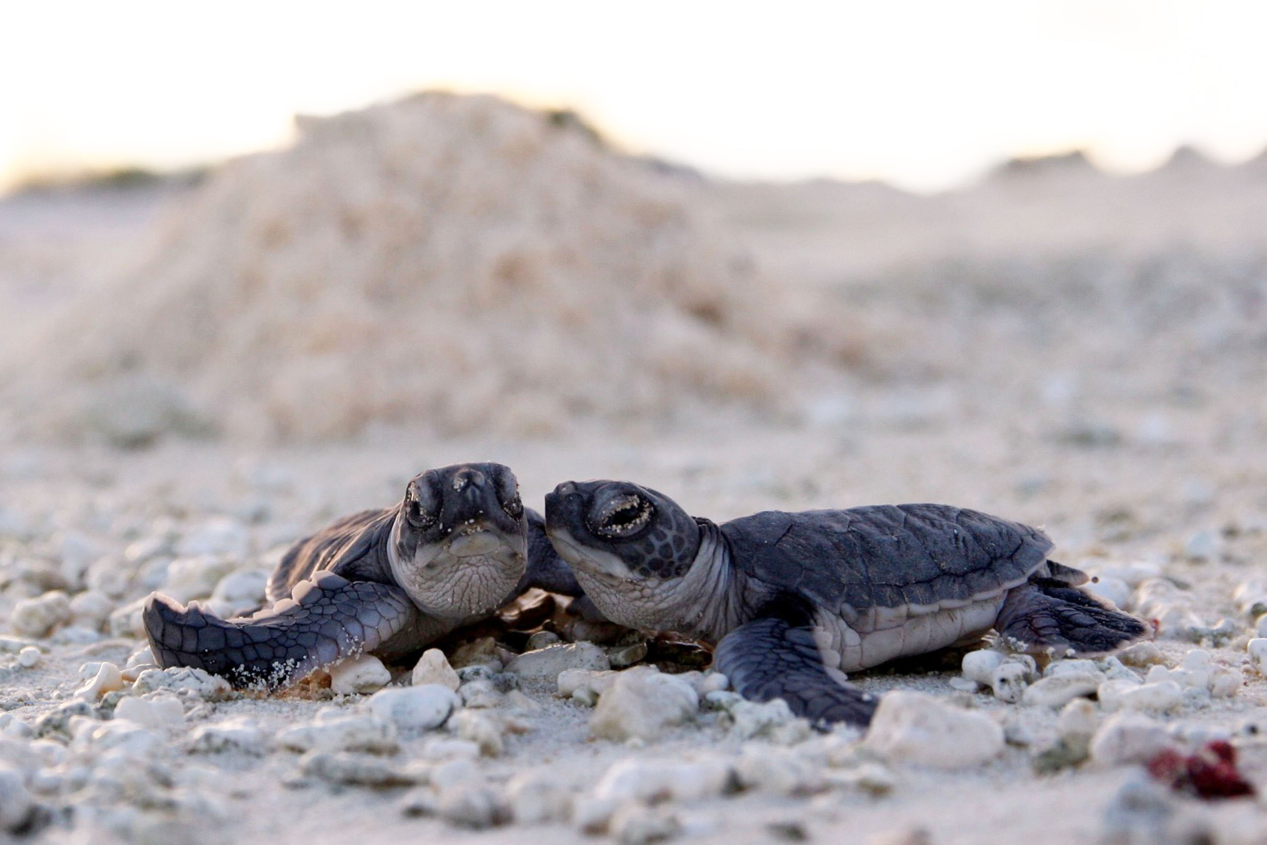 Freshly hatched pair of Green sea turtles / honu make their way to the ocean.