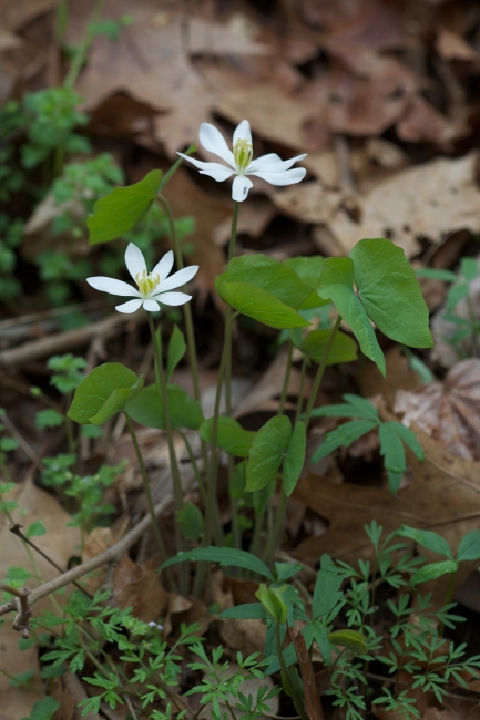 Twinleaf has one white flower atop a leafless stalk appearing in April-May.