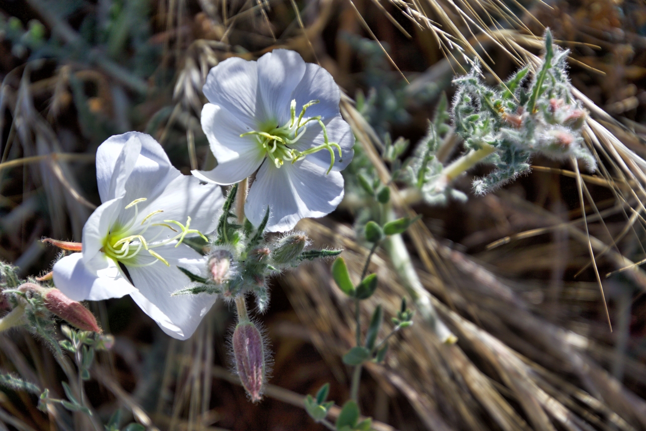 The Antioch Dunes evening primrose's 2- to 3-inch-wide flower has four pink or white, heart-shaped petals with yellow stamens in the middle. The plant can reach 2 ½ feet tall, and during the winter months, its stems dry and curl upward around its seed pod, creating a woody structure that looks like a birdcage.