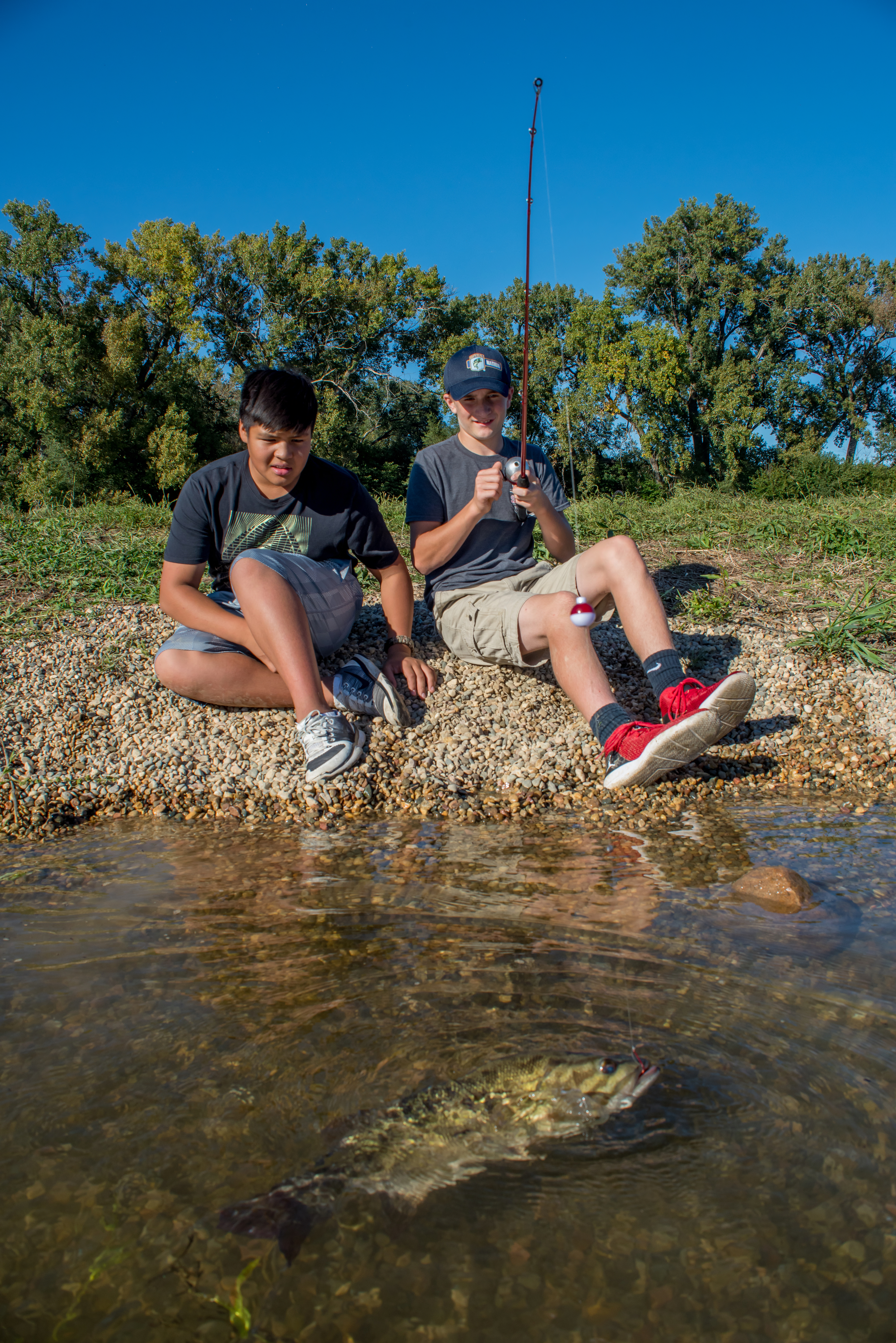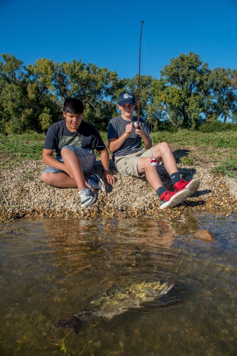 Two boys fishing for smallmouth bass.