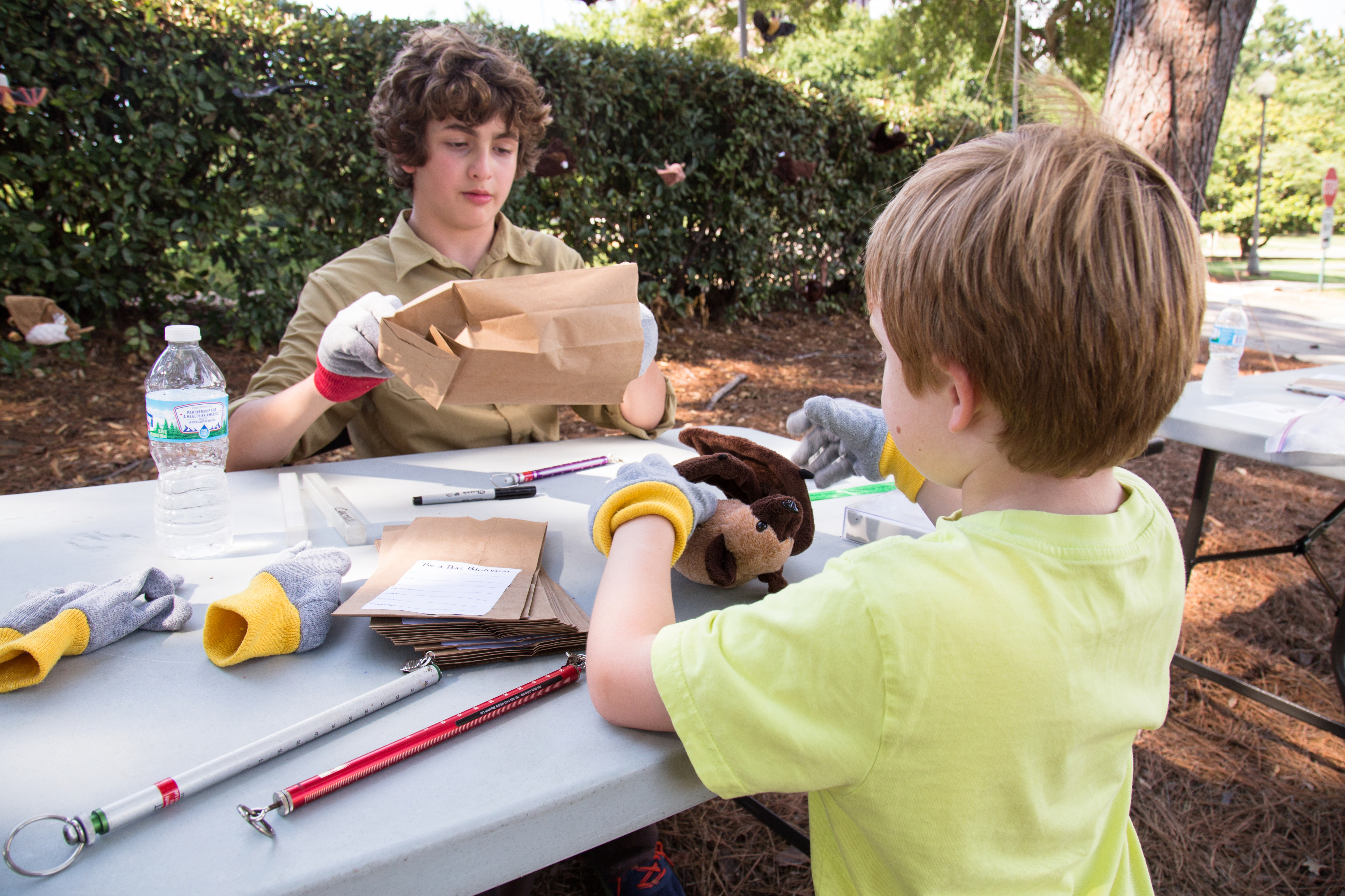 Two boys prerparing to examine bats. Bat Biologist for a day.Bat Education. This exercise was at the 2016 Southeastern Bat Diversity Network Bat Blitz at Jacksonville State Uiversity in Jacksonville, AL.