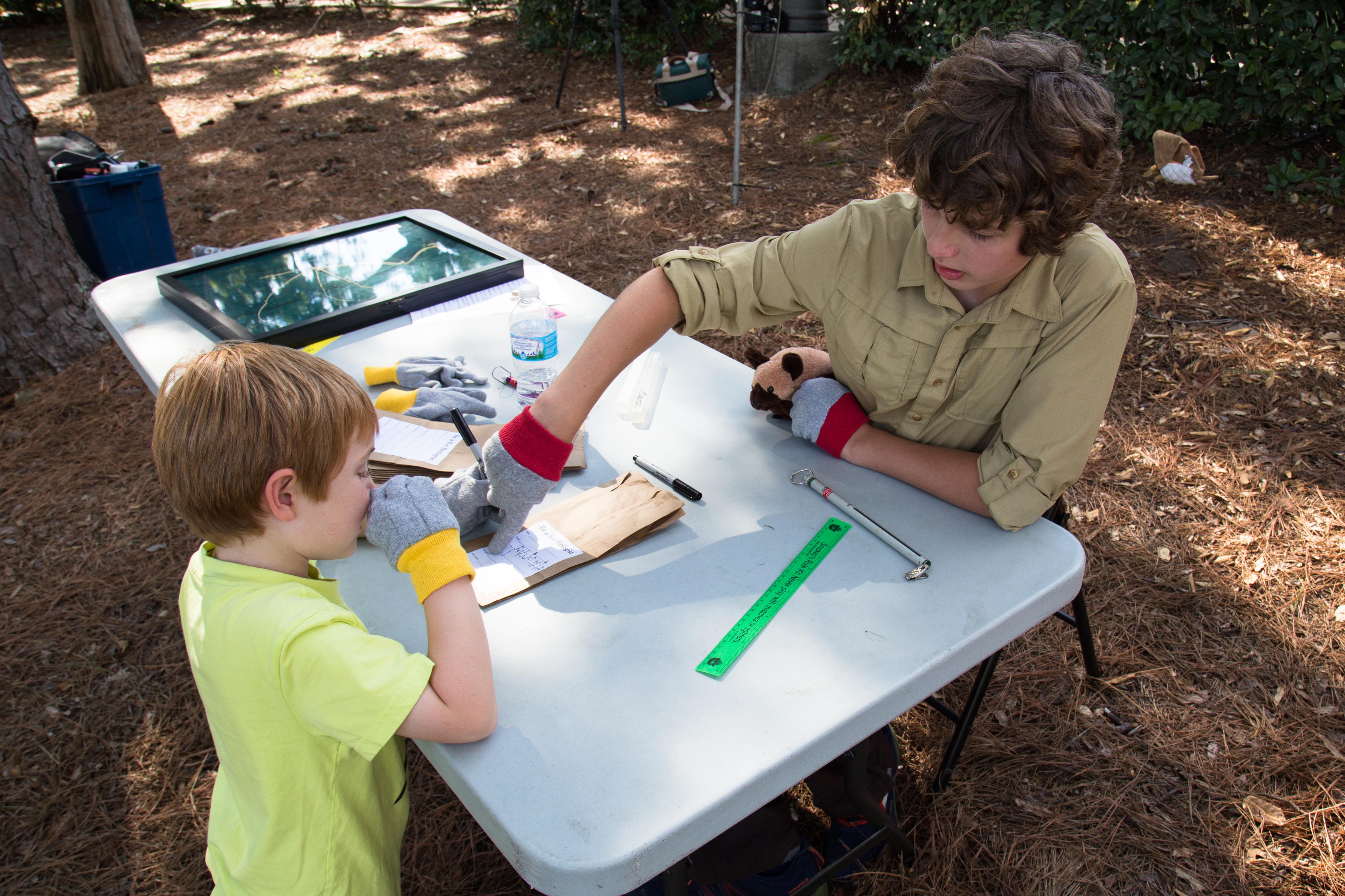 Two boys prerparing to examine bats. Bat Biologist for a day.Bat Education. This exercise was at the 2016 Southeastern Bat Diversity Network Bat Blitz at Jacksonville State Uiversity in Jacksonville, AL.