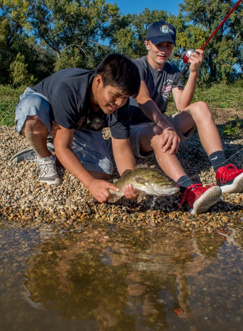 Two boys releasing small mouth bass