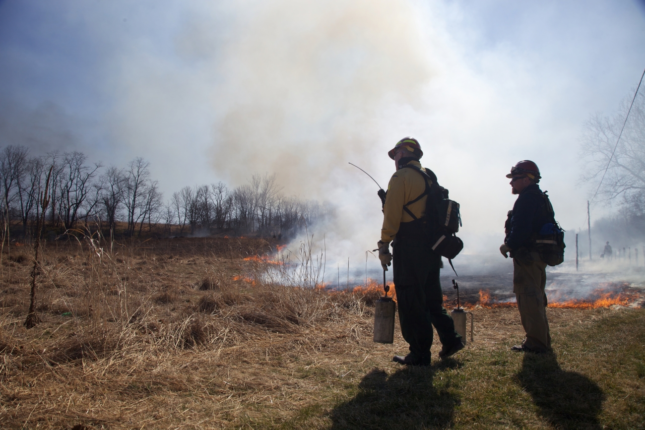 Two firefighters stand by burn area. NCTC Prescribed Burn