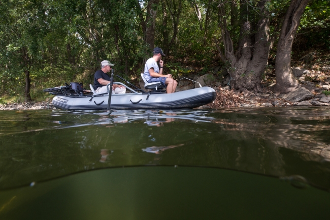 Two fishermen in a boat scouting fish along the river banks of the Potomac River