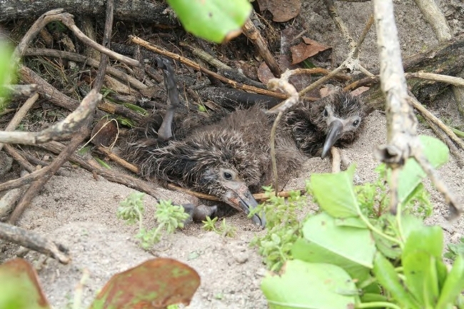 These two Laysan albatross chicks were buried by sand and vegetation after tsunami wave. The tsunami, generated by a powerful earthquake off the coast of Japan, struck the refuge at 11:36 PM on Thursday, March 10th and continued for the next few hours. On March 15, FWS released an official announcement stating that surveys of the three islands reveal that more than 110,000 albatross chicks – about 22% of this year’s albatross production – were lost as a result of the tsunami and two severe winter storms that hit in January and February. At least 2,000 adults also died.