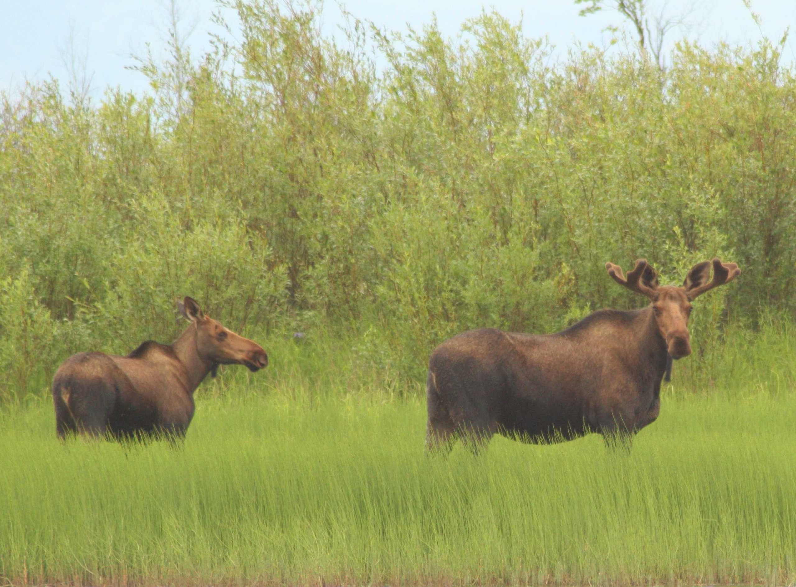Two moose stand in tall green grass at Kanuti National Wildlife Refuge in Alaska.