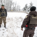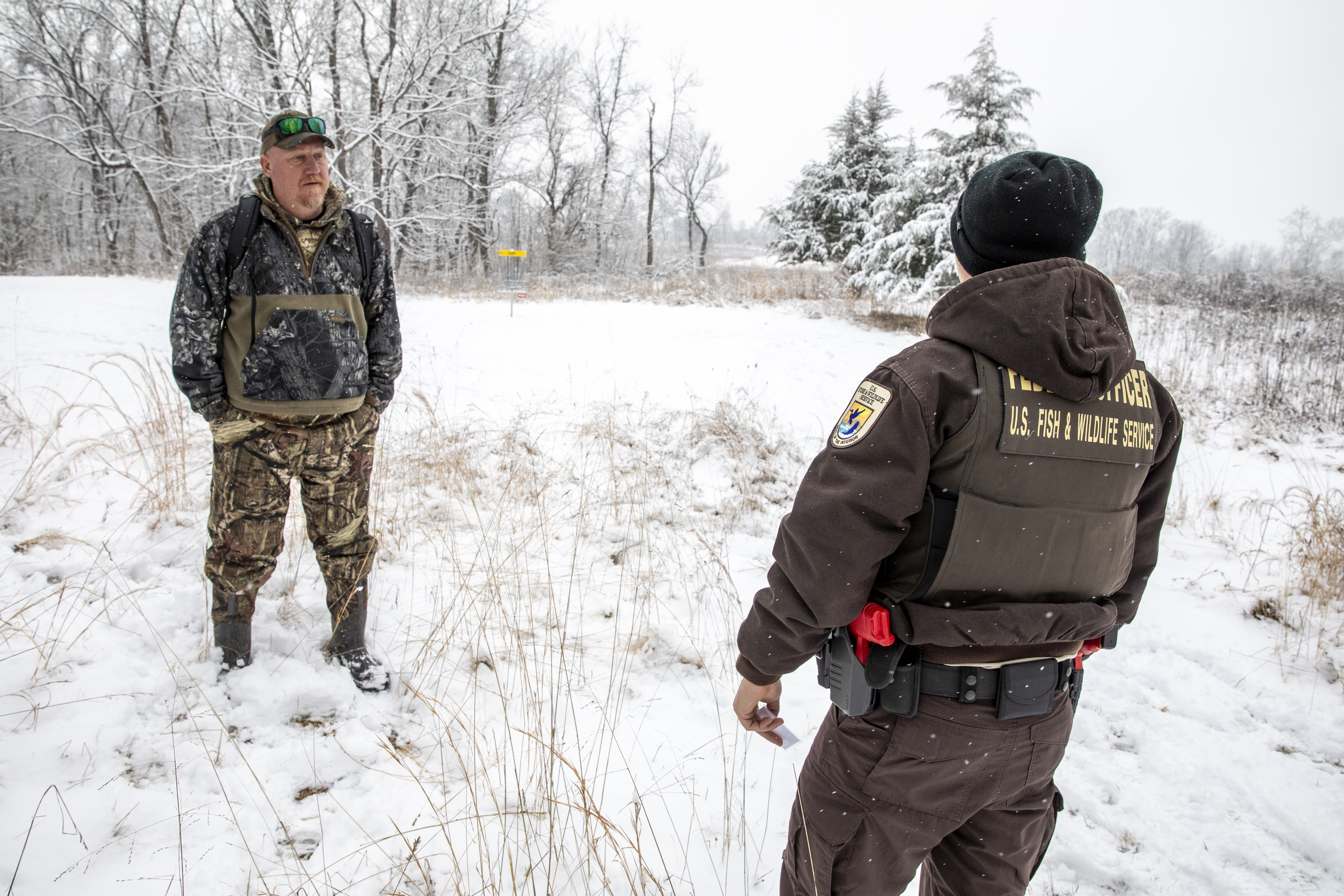 Refuge officers meeting in a field on a snow covered day.
