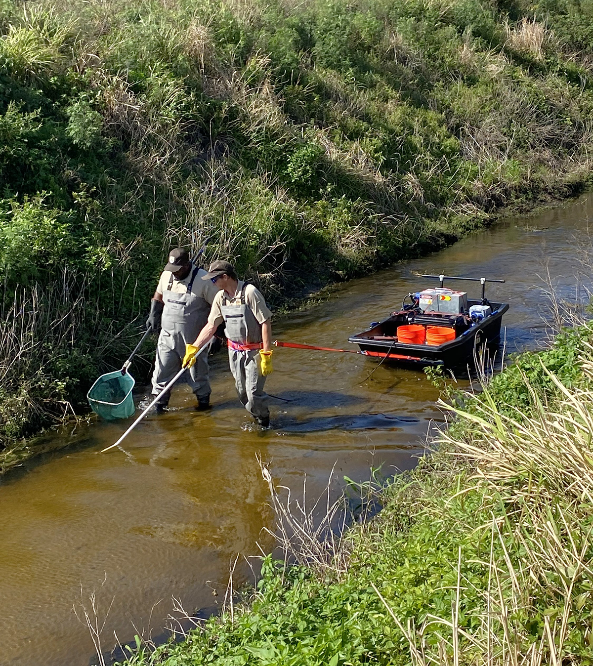 Two-person crew pulling a barge electrofisher.