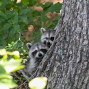 Two young raccoons peeking around trunk of tree