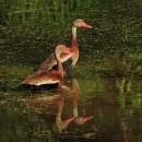 Two Roseate Spoonbills standing on a tree in the water at Yazoo NWR.