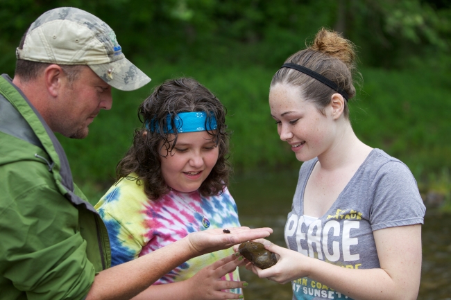 School children test water quality chemistry/survey macroinvertebrates at Seneca Rocks, WV.