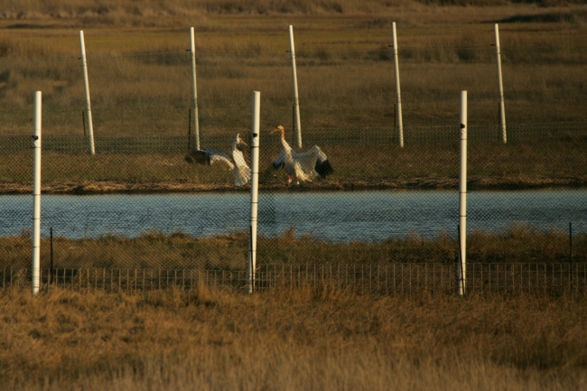A pair of playful Whooping cranes having fun on a sunny afternoon.