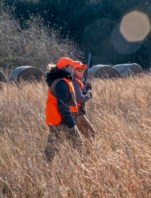 Two women dressed in upland hunting clothes walk across fall grassy field with shotgun.