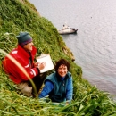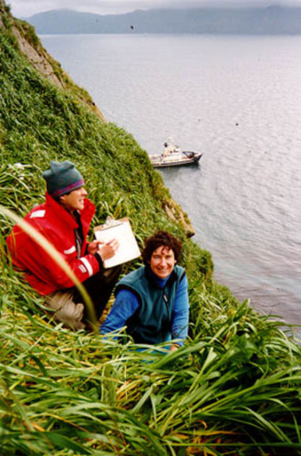 Jeff Williams, Rosa Meehan at end of Bird Survey line. Ulak is an annual monitoring site for burrow nesting seabirds such as tufted puffins, storm petrels and Cassin's auklets