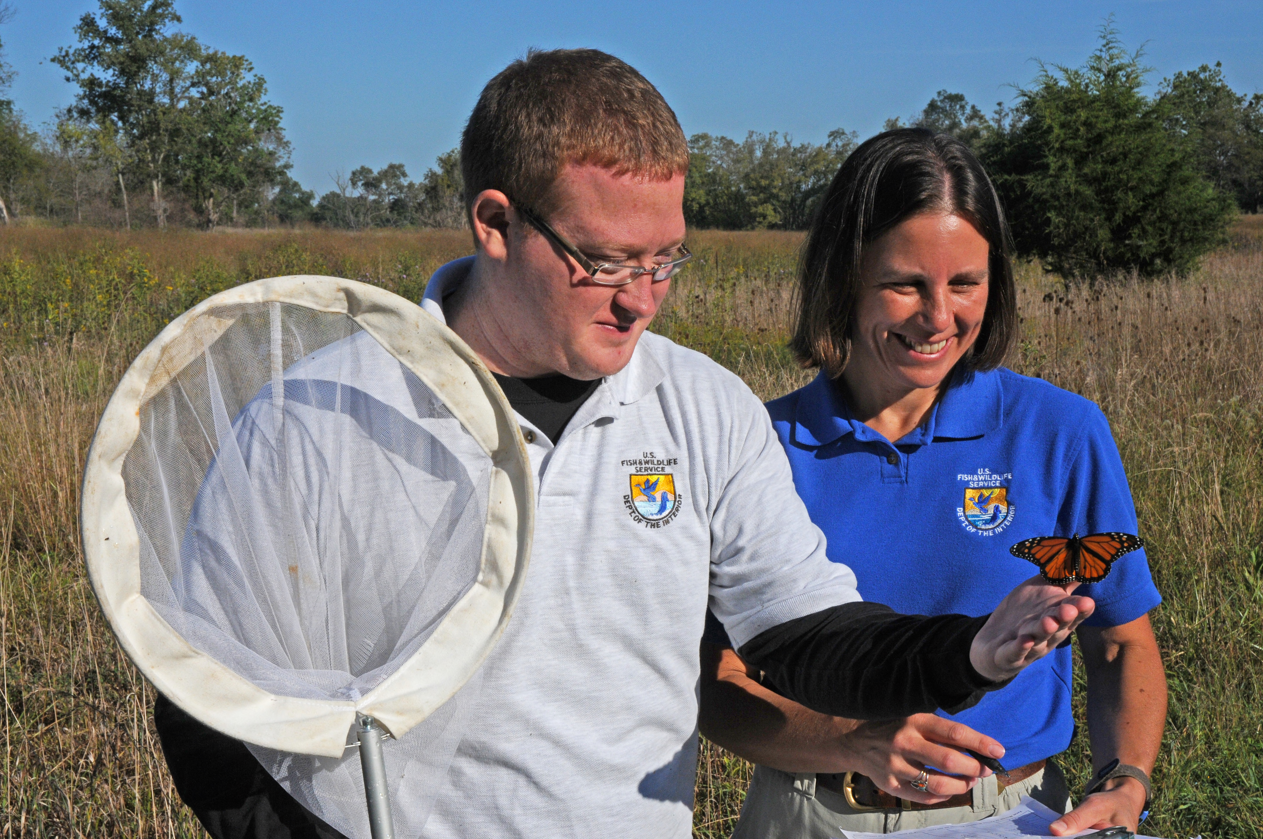 U.S. Fish and Wildlife Service biologists hold Monarch butterfly during tagging process.
