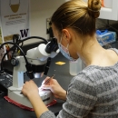 A staffperson at the University of Washington's Rare Plant Care and Conservation program uses tools to remove the seed coat on seeds of the endangered showy stickseed (Hackelia venusta)