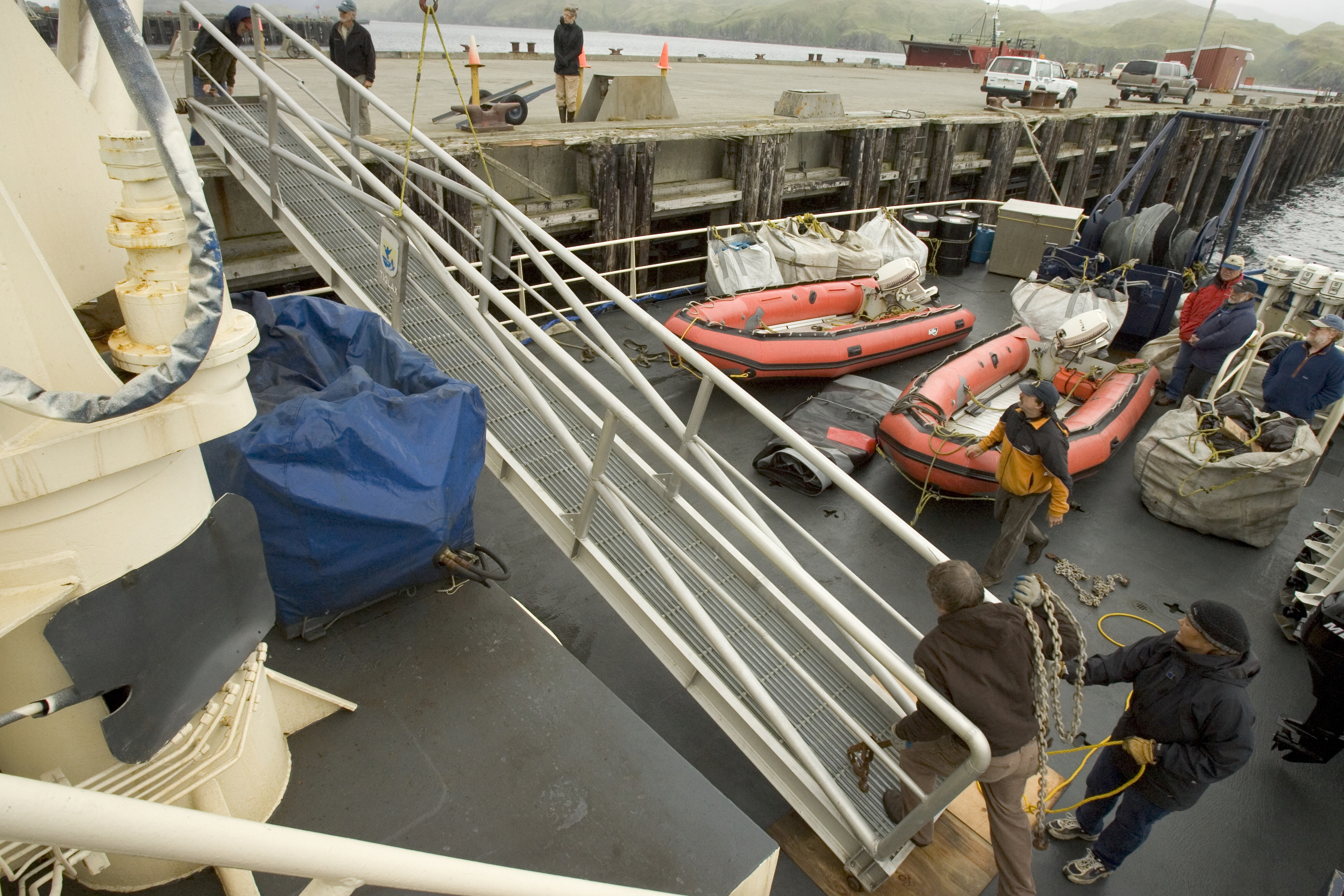 Shows items being unloaded from a boat to a boat dock at the refuge.