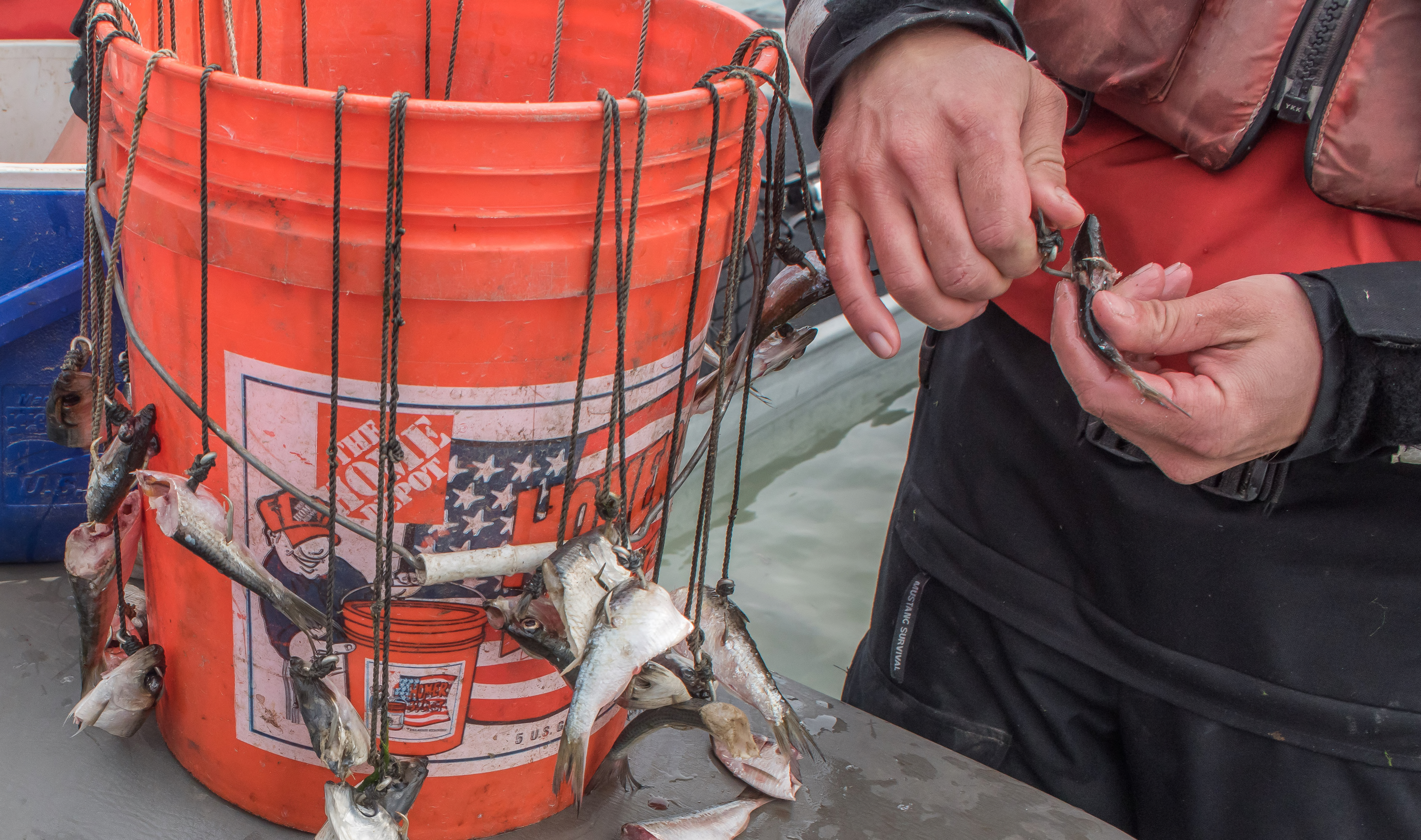 U.S. Fish and Wildife Servie fisheries crew baiting lines for lake sturgeon