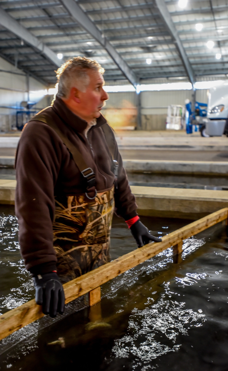 U.S. Fish and Wildlife Service (USFWS) employee at Pendills Creek National Fish Hatchery prepares fish pump to load fish onto hatchery.