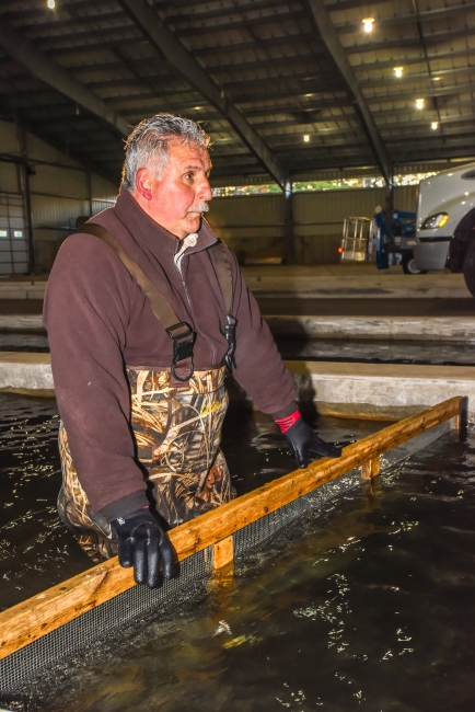 U.S. Fish and Wildlife Service (USFWS) employee at Pendills Creek National Fish Hatchery prepares fish pump to load fish onto hatchery.