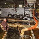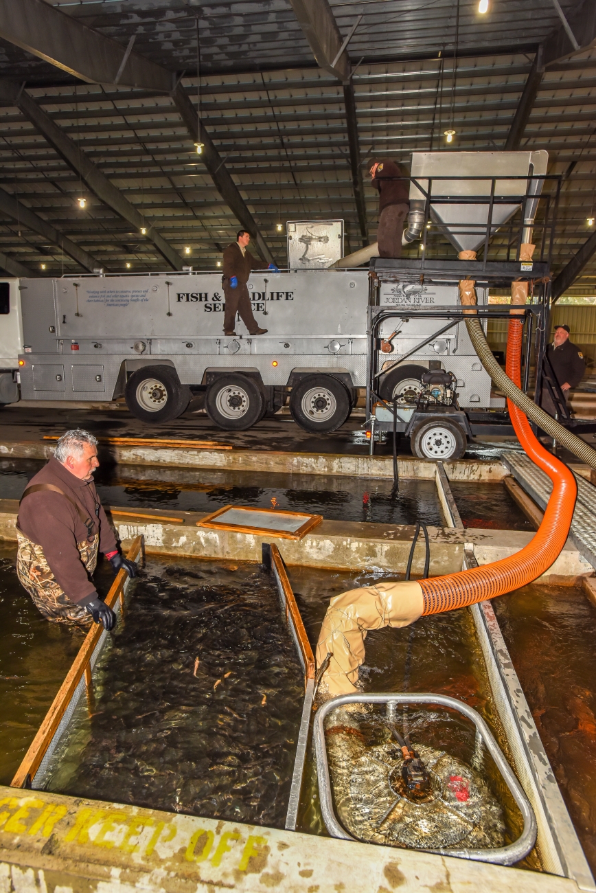 U.S. Fish and Wildlife Service (USFWS) employees at Pendills Creek National Fish Hatchery prepare fish pump to load fish onto hatchery.