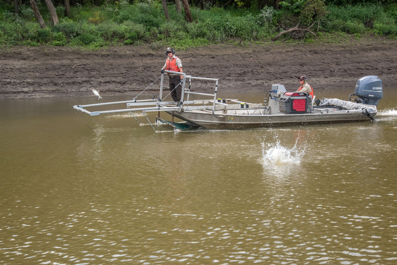 U.S. Fish and Wildlife Service boat, Dozer Trawler, Lamine River, Missouri, searching for invasive carp.