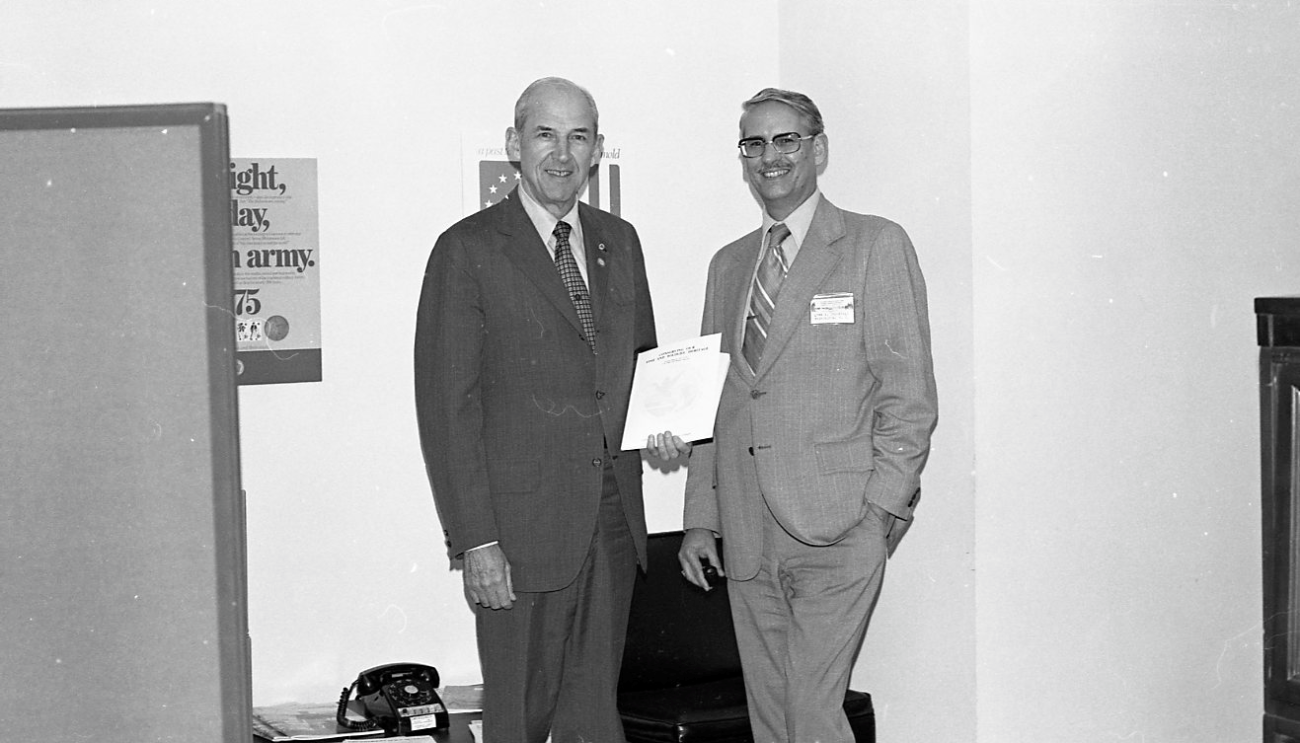 U.S. Fish Wildlife Service Director Lynn A. Greenwalt (right) presenting an award to John S. Gottschalk (left); Mr. Gottschalk was the Director of the Bureau of Sport Fisheries and Wildlife from 1964-1970. Circa mid- to late-1970s.