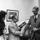 Lynn Greenwalt (right), Director, U.S. Fish and Wildlife Service, presents a copy of the book Sport Fishing USA to Shiro Inoue (center), Vice President of the Japan Sportfishing Foundation, April 29, 1975.