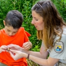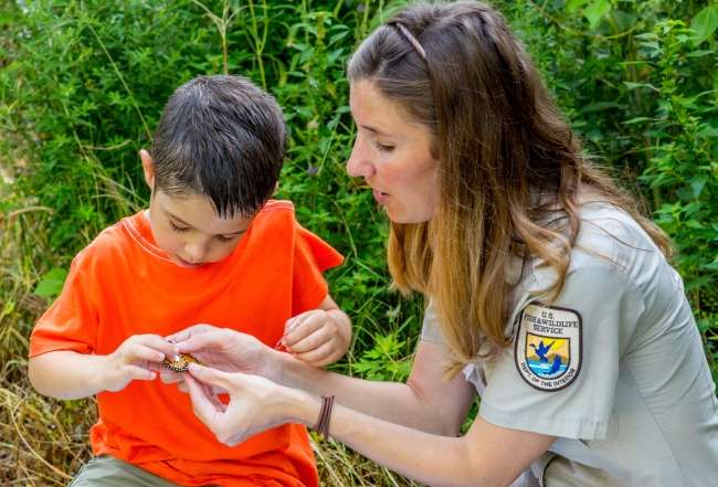 U.S. Fish and Wildlife Service employee and little boy look at tagged monarch