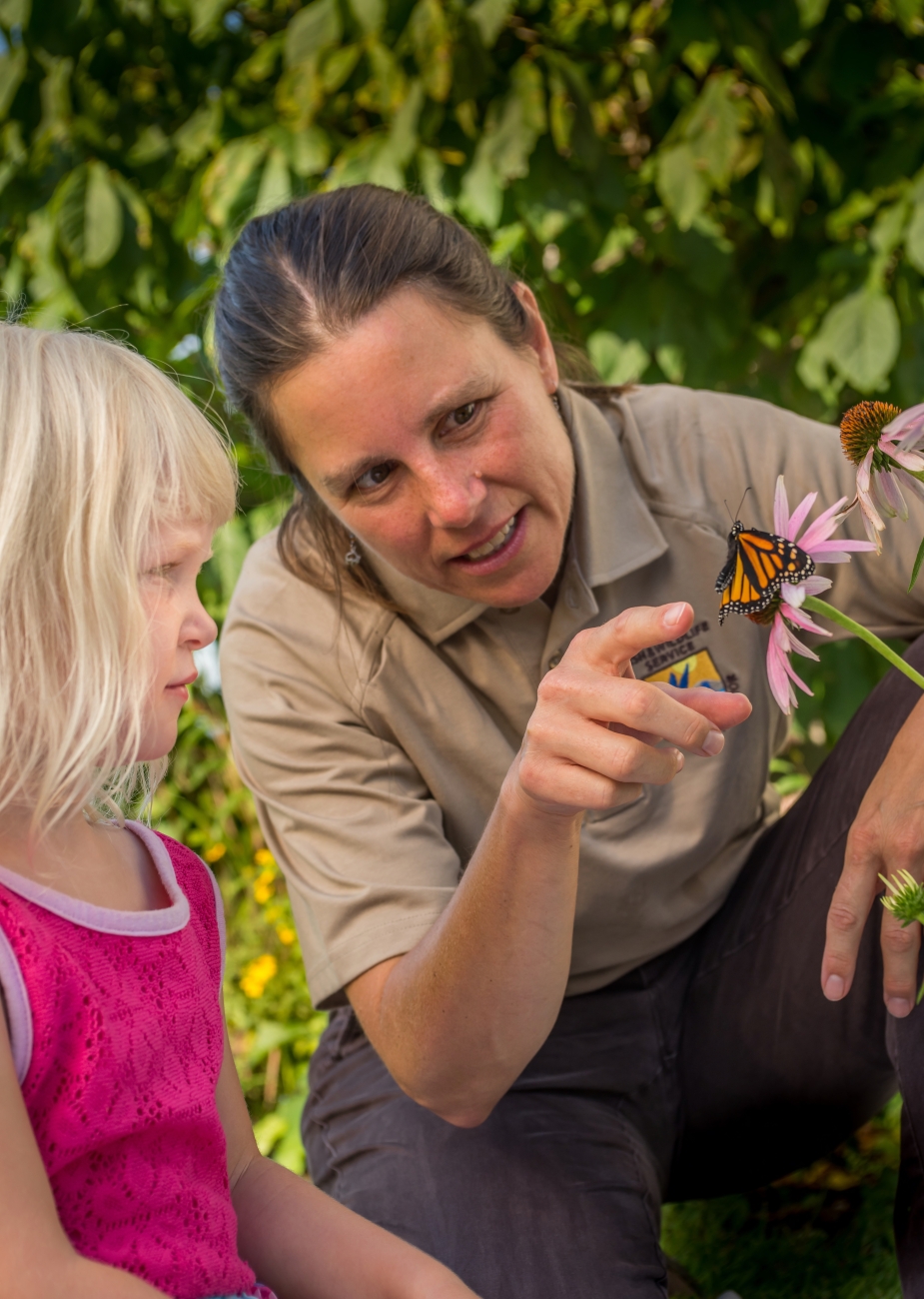 FWS employee with little girl look at monarch on flower