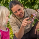 U.S. Fish and Wildlife Service employee with little girl look at monarch on flower