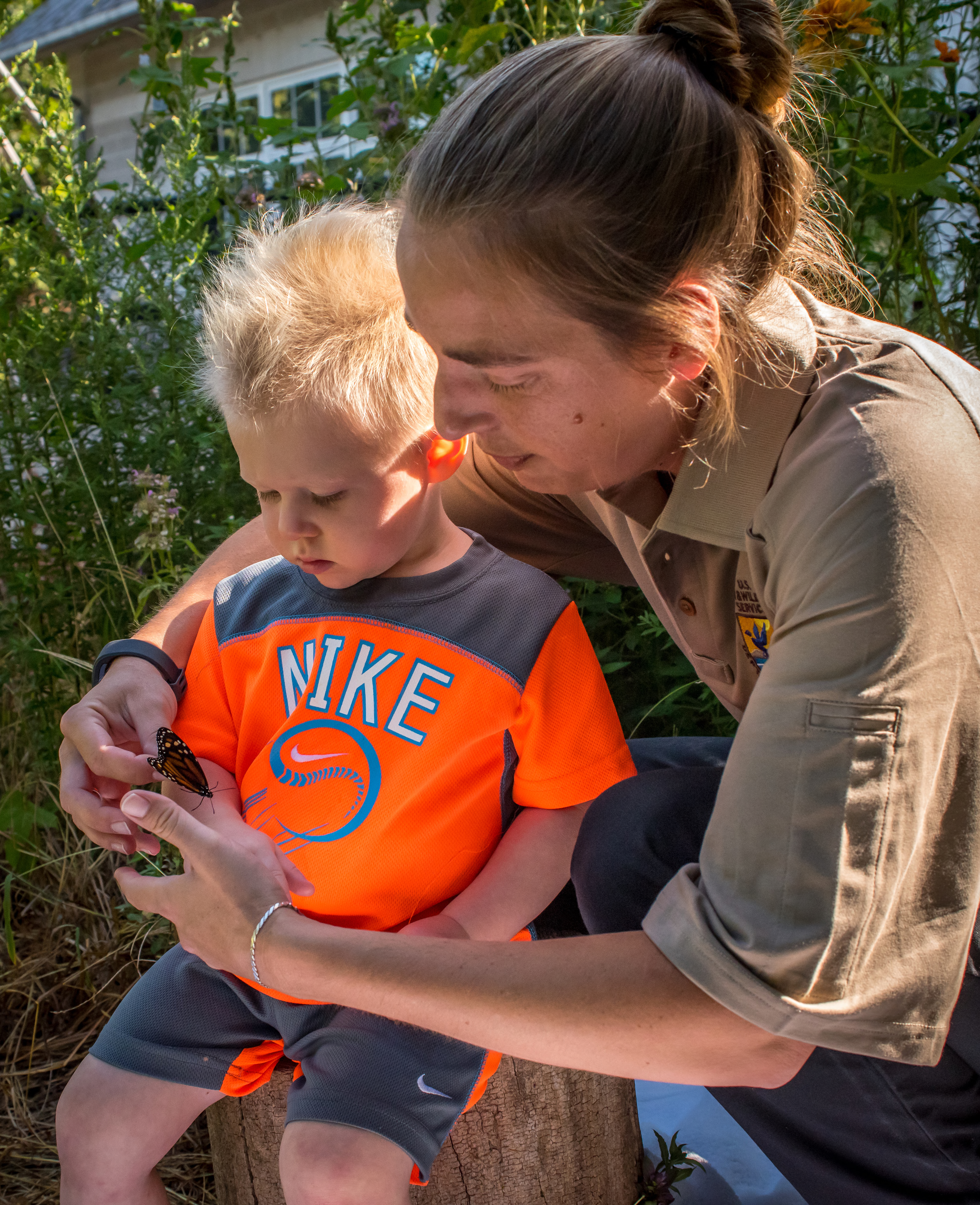 U.S. Fish and Wildlife Service employee shows child a monarch