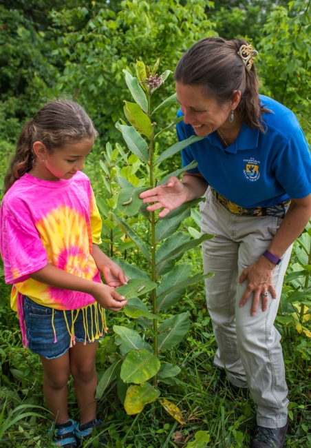 U.S. Fish and Wildlife Service employee shows young girl a Monarch caterpillar