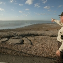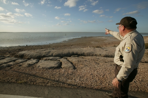 Panoramic view of the coast of Laguna Atascosa National Wildlife Refuge, Bahia Grande wetland habitat restoration, with U.S. Fish and Wildlife Service employee showing expanse.
