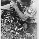 Original caption: U.S. Fish and Wildlife Service Bureau of Sport Fisheries and Wildlife fish hatchery employee emptying a net of catchable Brook Trout into a raceway at a National Fish Hatchery, c. 1966. Location could possibly be the National Fisheries Center-Leetown, West Virginia.