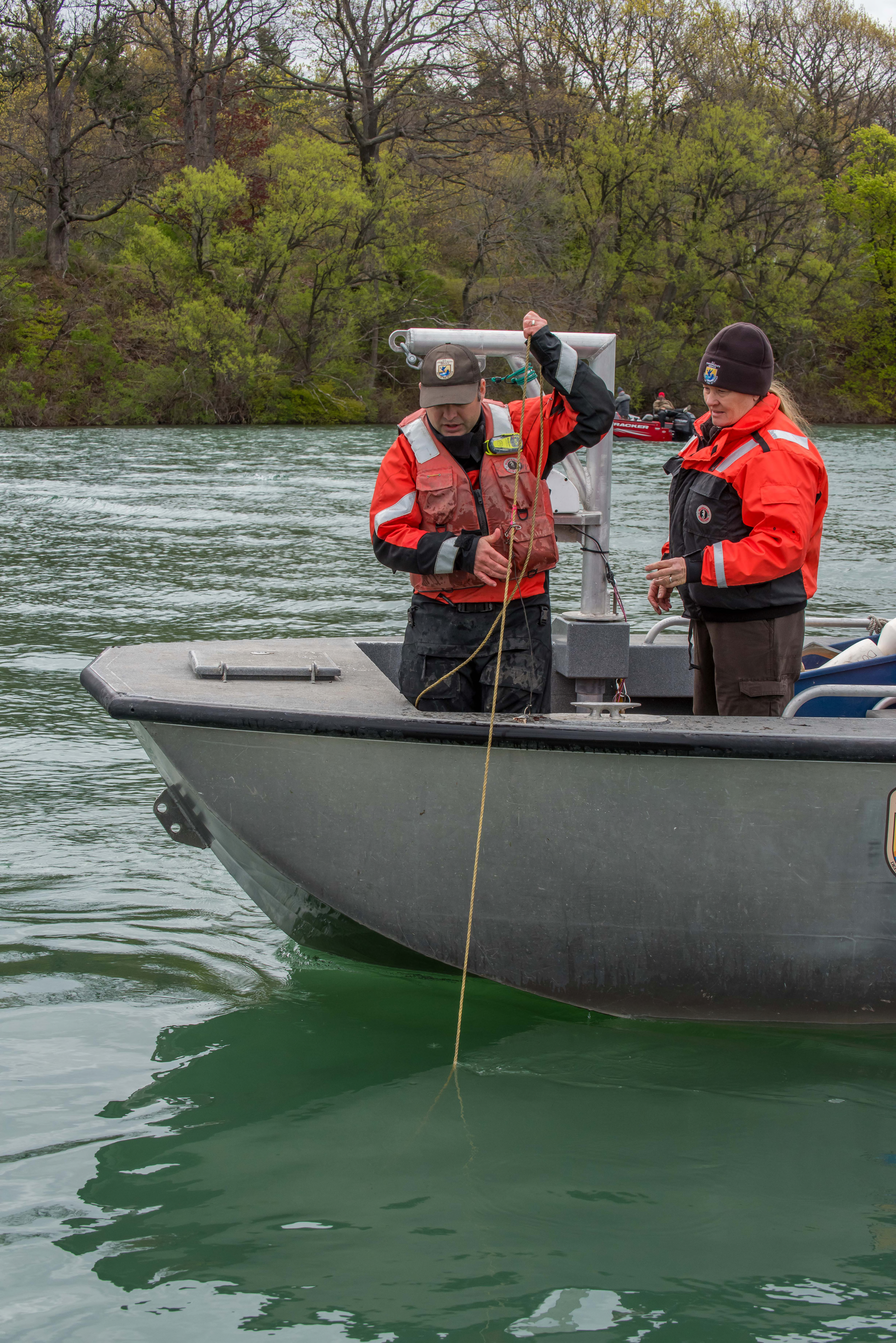 USFWS Fisheries crew in boat preparing for lake sturgeon field work on the Niagara River.